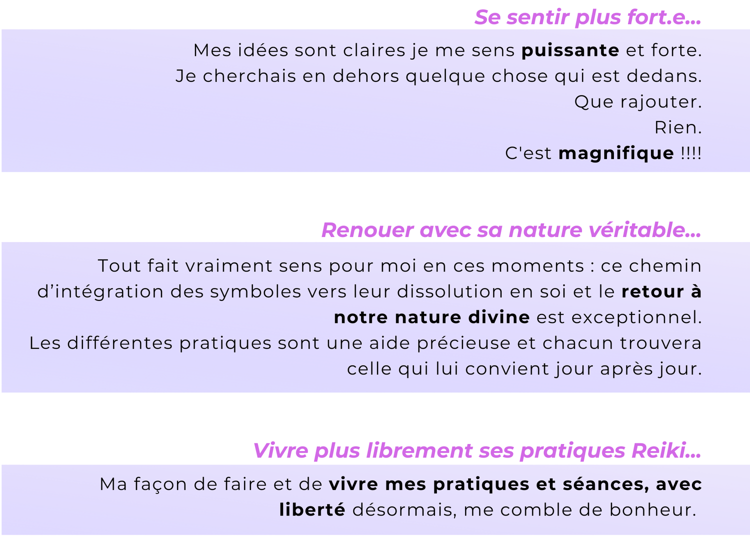 Tu explores des approches épurées et puissantes, au plus proche de l'esprit originel du Reiki, qui enrichissent ta pratique et propulses ses effets bénéfiques.