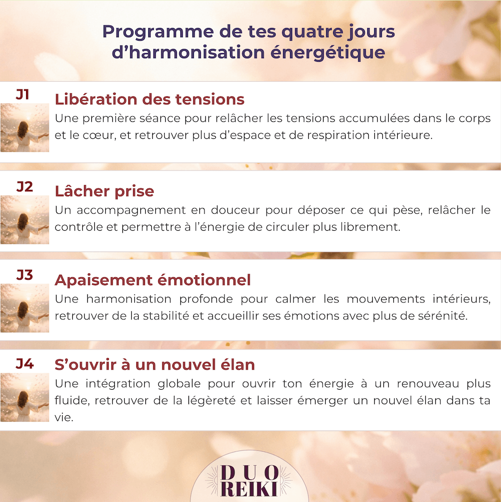 Durant quatre jours consécutifs, tu bénéficies de deux séances énergétiques collectives soit un total de huit soins ciblés.